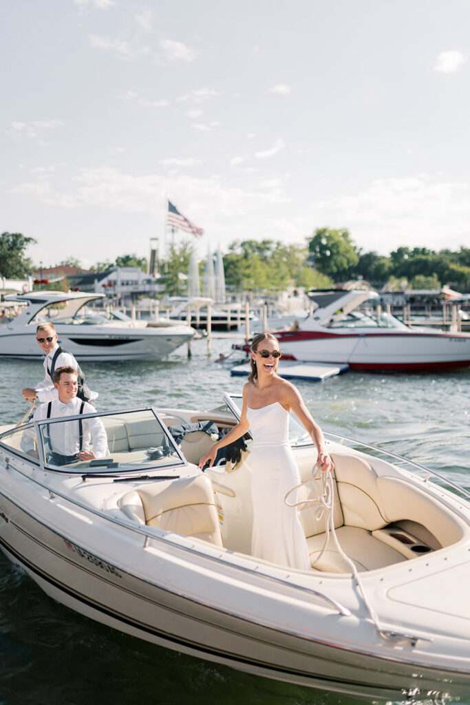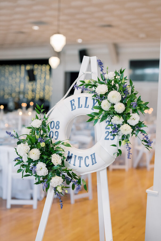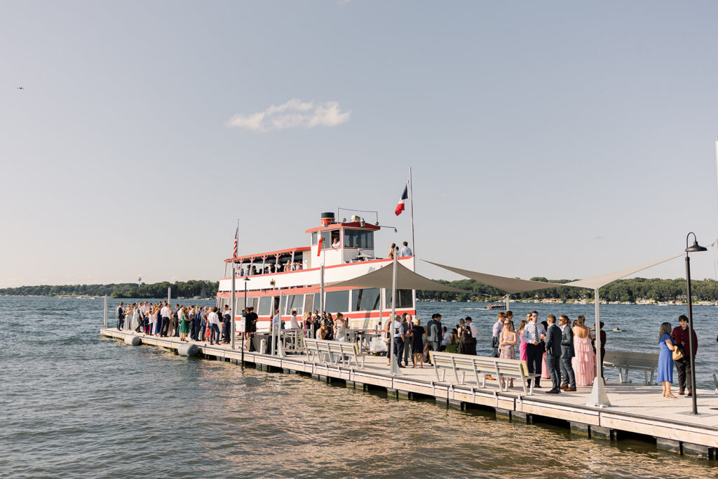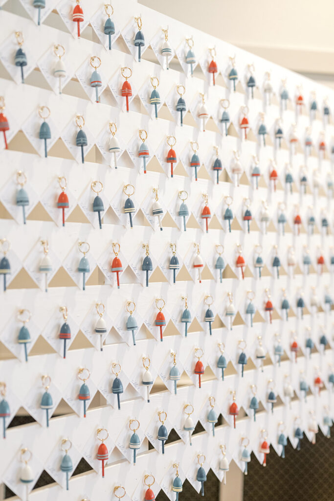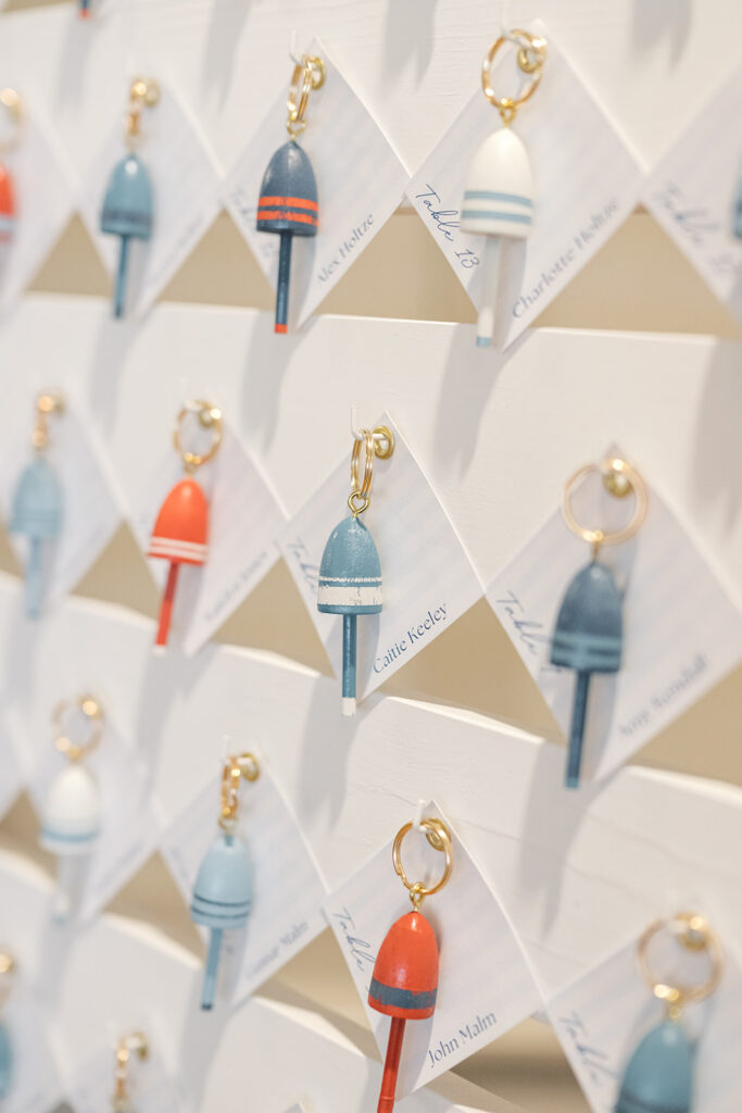 From there, the day unfolded with thoughtful, lake-inspired details that made everything feel uniquely them. Guests made their way from ceremony to reception by boat, fully embracing the Okoboji lifestyle. One of my favorite touches was the seating display made up of miniature buoys alongside a custom map of the lake which served as the guest book. It was creative, personal, and perfectly tied into the setting.
